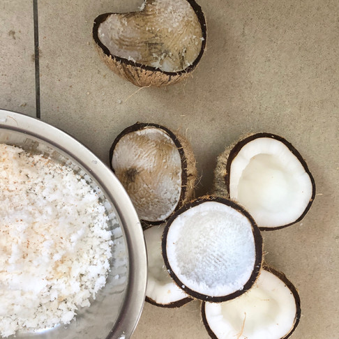Some pictures of young coconuts being grated using traditional methods at our home in Tanzania